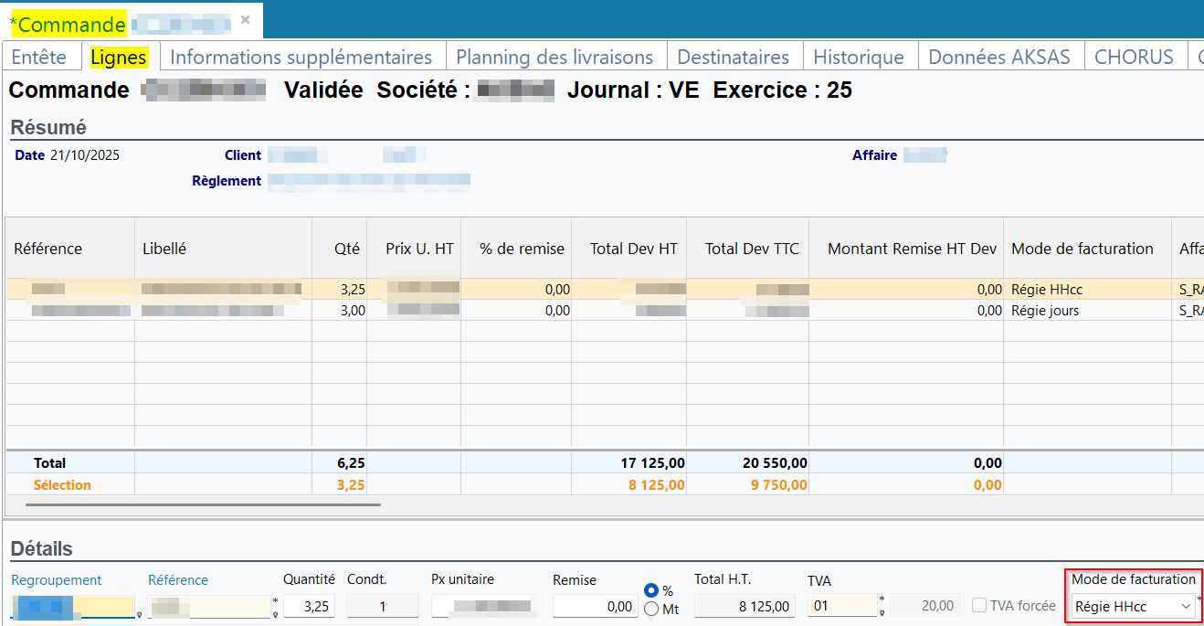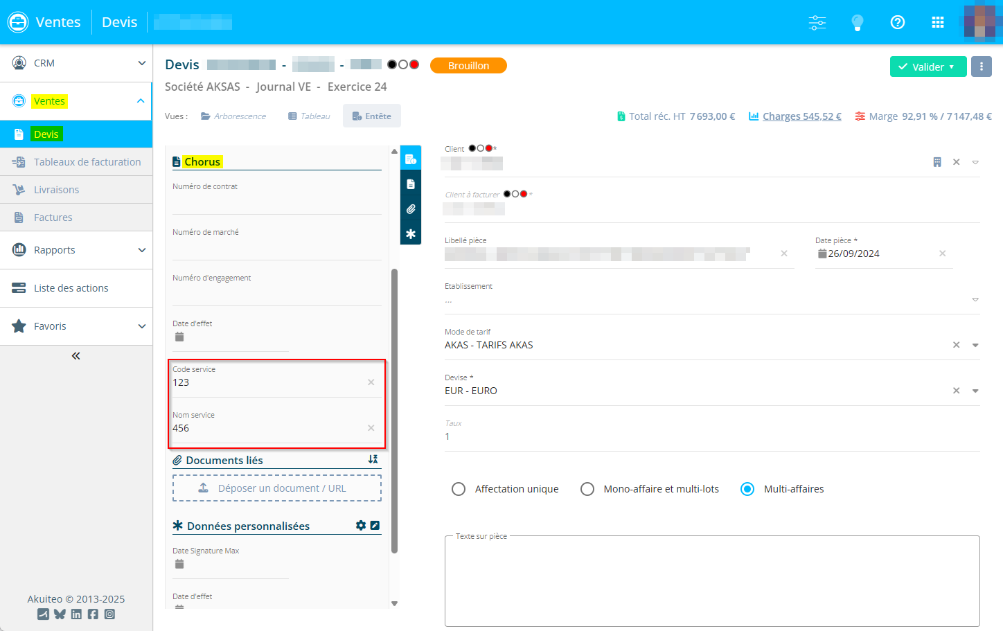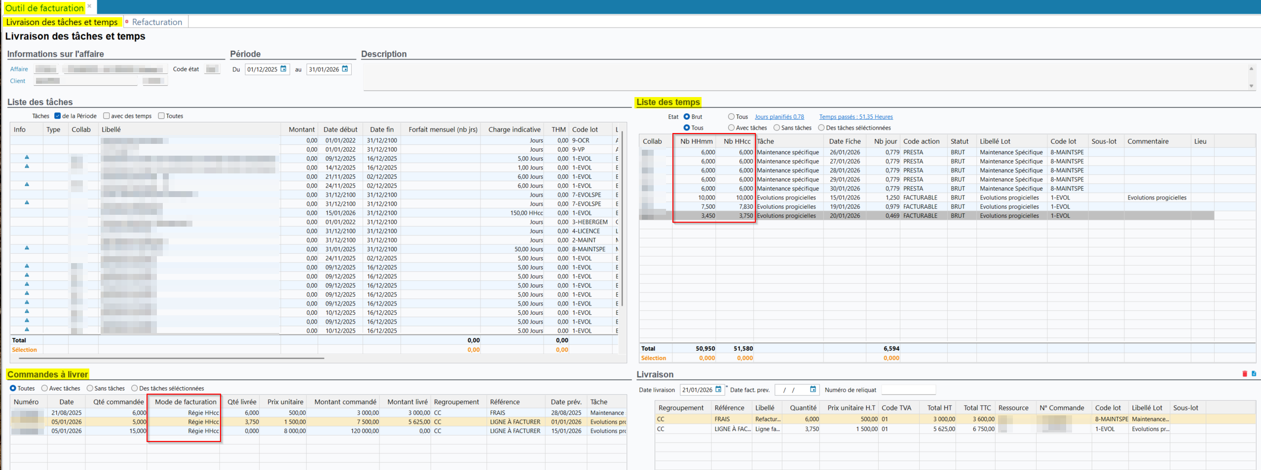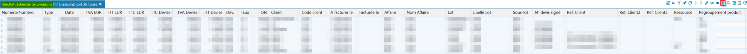 Désormais, la colonne Client Facturé affiche également le client facturé pour les autres pièces de la chaîne vente qui peuvent contenir un client facturé : contrats client, devis, commandes client, livraisons, tableaux de facturation client.