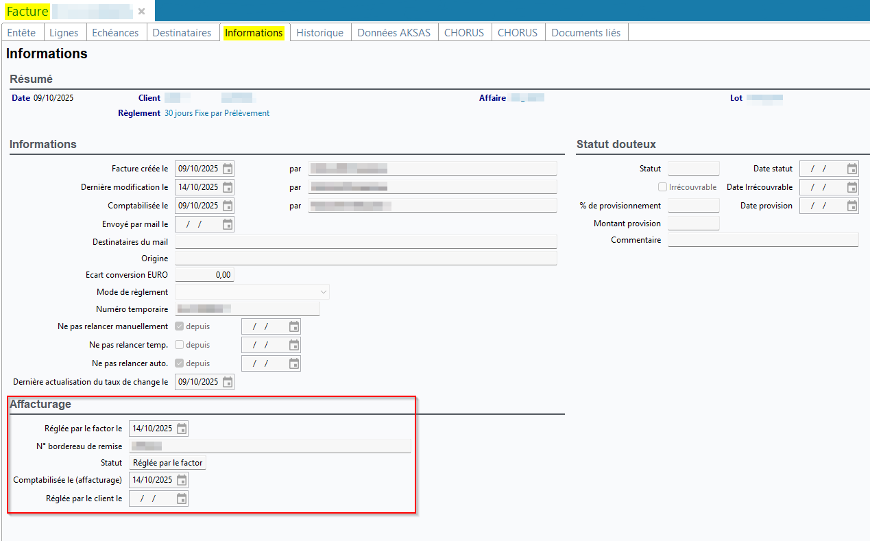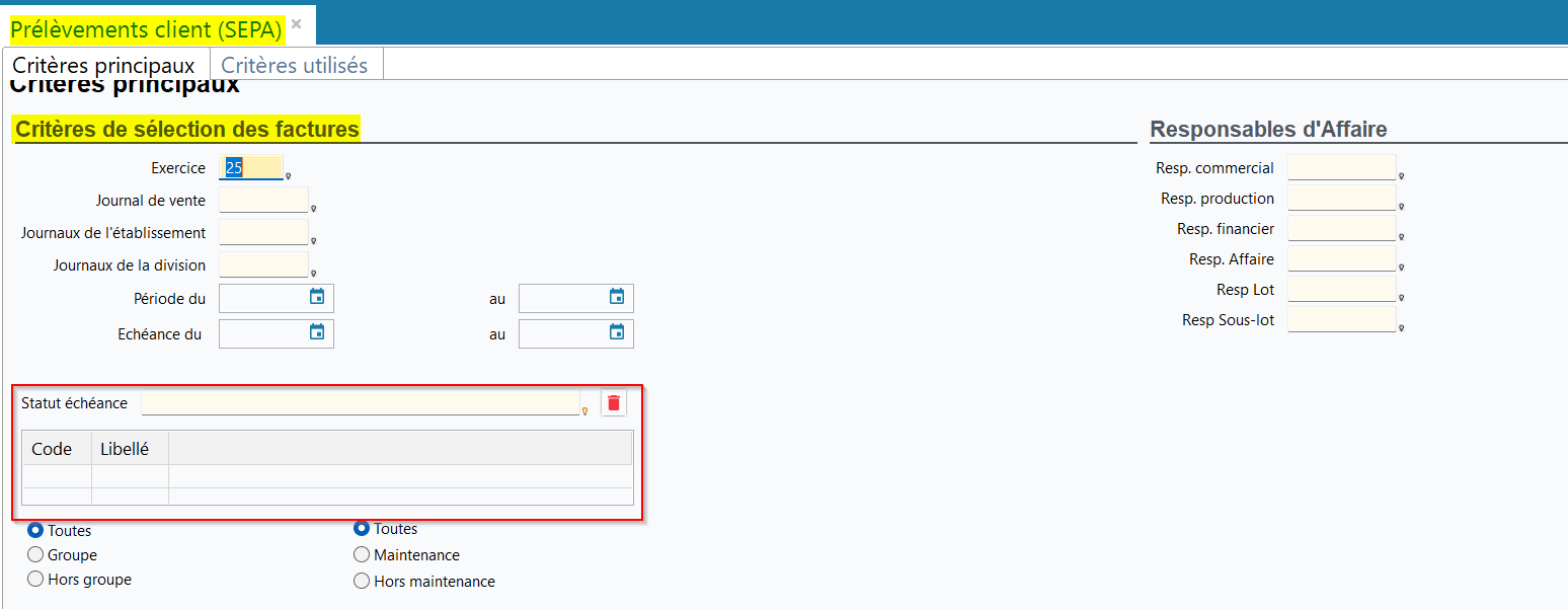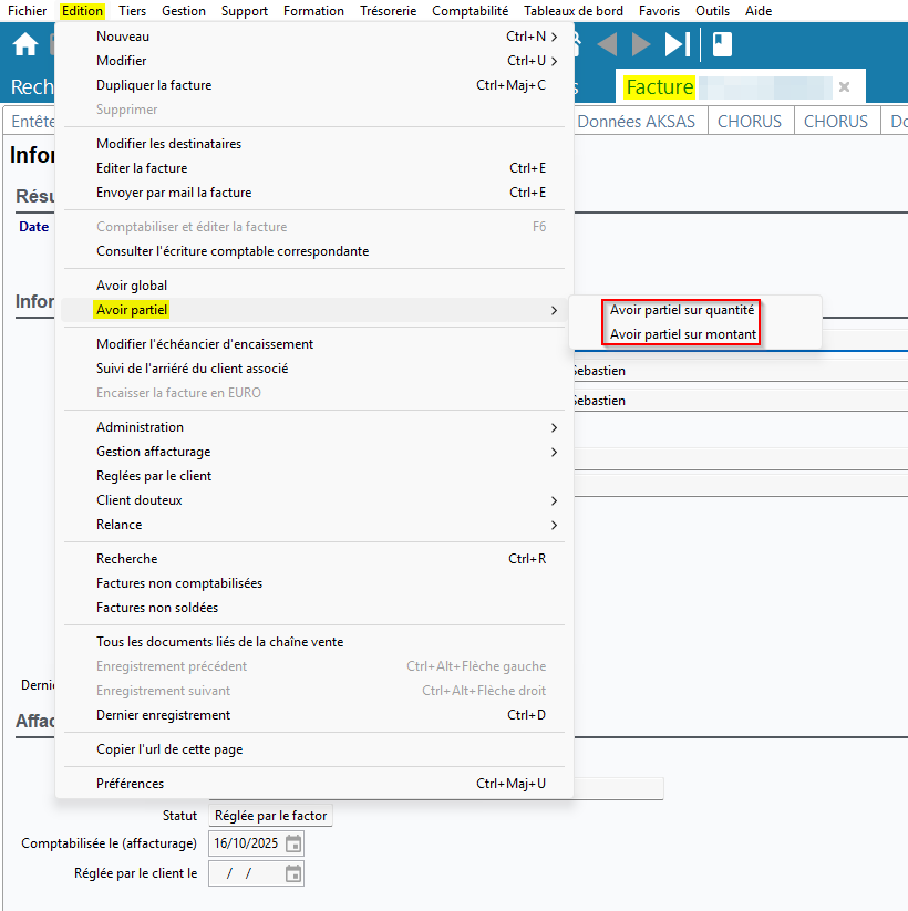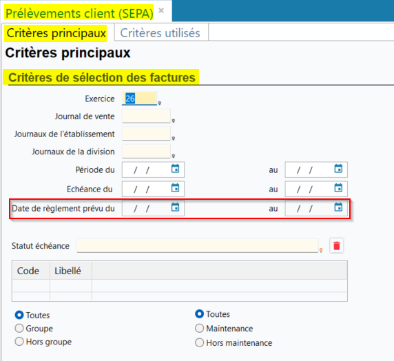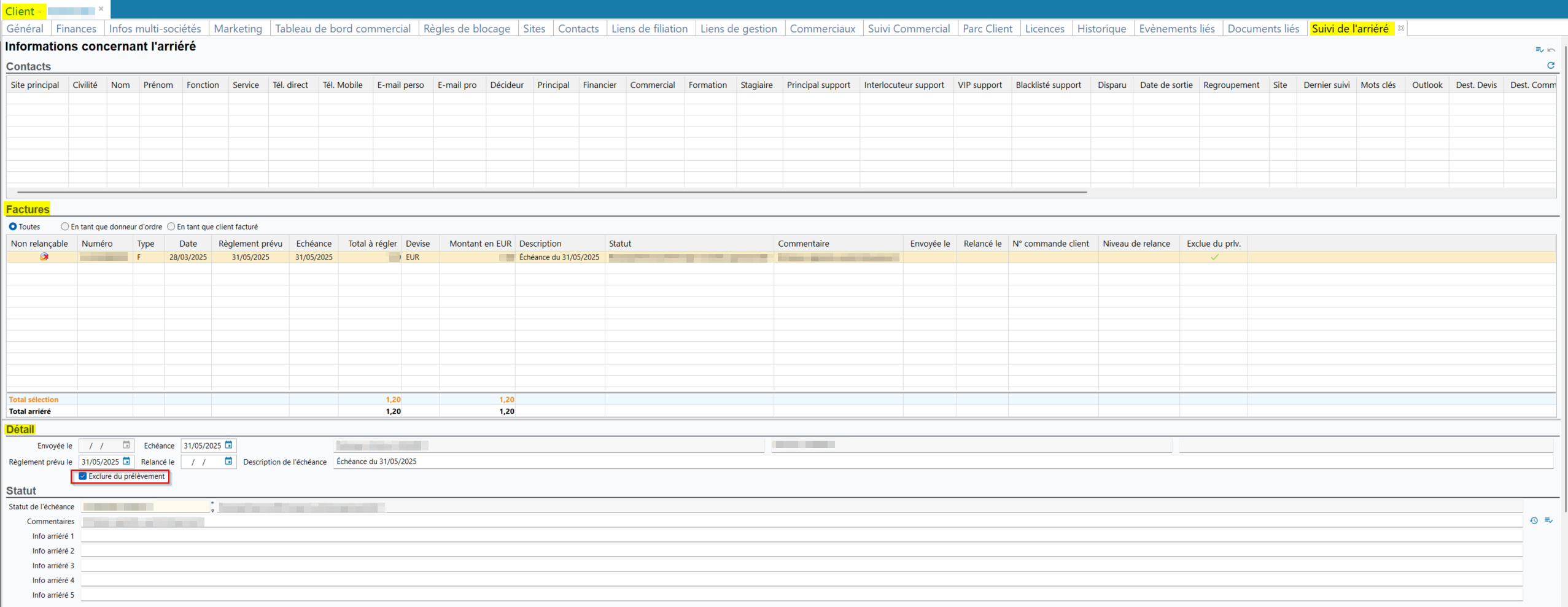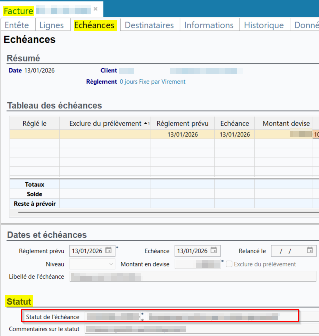 Désormais, un blocage a été ajouté et les conditions de règlement ne peuvent plus être modifiées pour les factures incluses dans un prélèvement même si l'option Recalculer la date d'échéance est décochée.