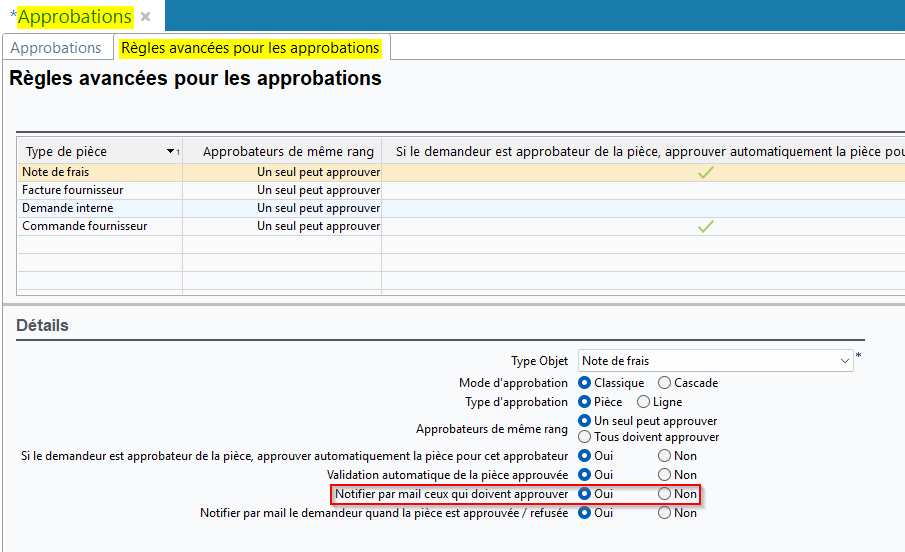 Les approbations permettent de créer des règles spécifiques pour certaines pièces de gestion (Outils > Paramétrage > Paramétrage Général > Ressources et Main d’œuvre > Approbations) afin que les collaborateurs puissent demander l'approbation du responsable ou d'une personne responsable pour faire avancer le cycle de vie de certaines pièces de gestion.