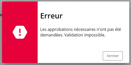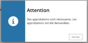 Lors de la comptabilisation de la facture depuis Edition > Comptabiliser la facture ou Comptabiliser et éditer la facture, une vérification est effectuée afin de déterminer s'il existe un système d'approbations sur les factures client et si toutes les approbations ont été reçues. Si toutes les approbations n'ont pas été données, alors la comptabilisation est bloquée et un message d'erreur s'affiche.