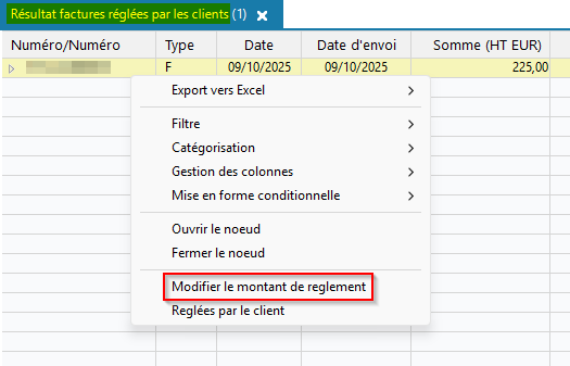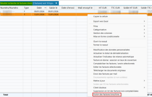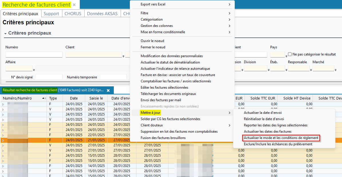 Dans les résultats de recherche de factures (Gestion > Ventes > Factures), les conditions de règlement peuvent être modifiées sur plusieurs factures à la fois par clic droit sur une sélection > Mettre à jour > Actualiser le mode et les conditions de règlement.