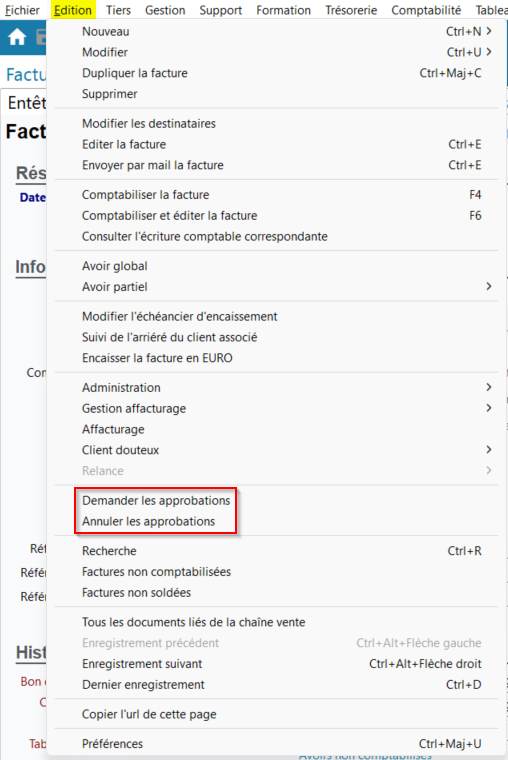 Désormais, les factures client brouillon (Gestion > Ventes > Factures) peuvent être soumises au système d'approbation avant leur comptabilisation (Edition > Comptabiliser la facture ou Comptabiliser et éditer la facture) afin que le ou les responsables définis dans les règles d'approbations puissent vérifier les informations saisies par les collaborateurs.