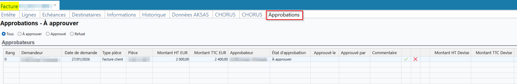 L'onglet Approbations a été ajouté à la facture de vente et affiche les informations relatives aux approbations pour la facture en cours de consultation. Il est possible d'approuver ou de refuser la facture depuis cet onglet.
