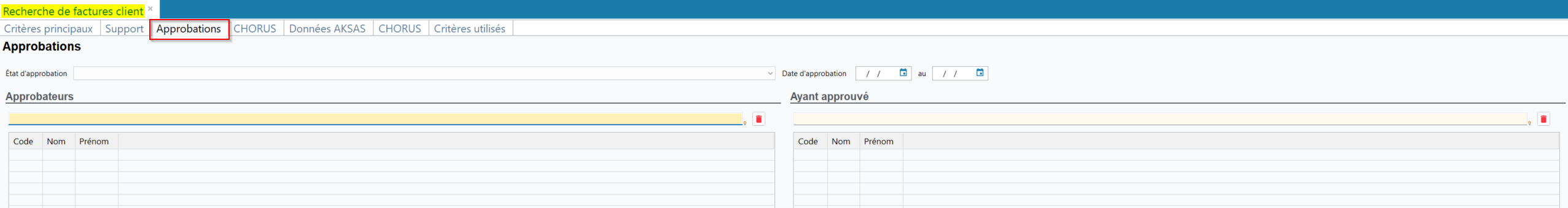 Dans l'écran de recherche des factures, l'onglet Approbations a également été ajouté. Il permet de définir des critères de recherche pour les factures brouillon, en fonction de leur statut d'approbation, des approbateurs devant approuver ou ayant approuvé.
