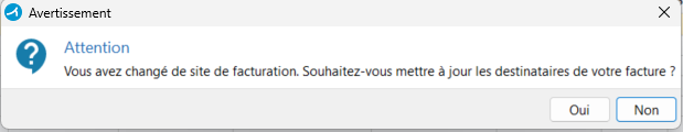 Si un contact du site de facturation initial est coché Factures tous sites (onglet Général > section Destinataire de), celui-ci sera toujours le destinataire de la facture, même si l'utilisateur clique sur Oui.