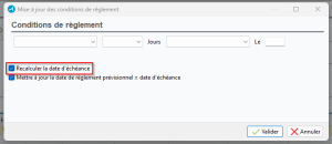 Sur la fenêtre, l'option Recalculer la date d'échéance peut être décochée afin de ne pas recalculer la date d'échéance sur les factures.